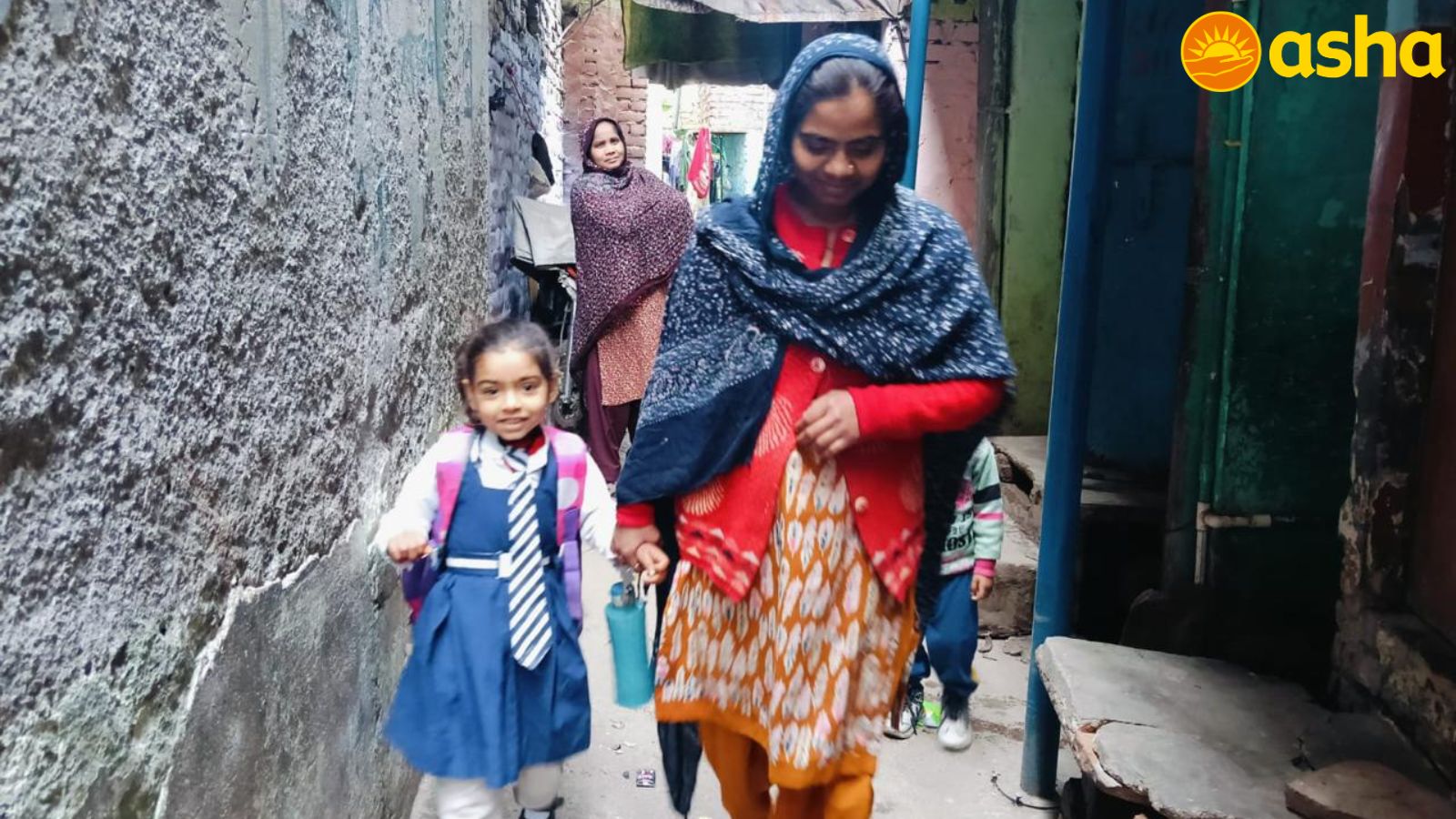 One afternoon, an education team member from Asha Society, Sugra, noticed Inaya sitting alone outside her home, her eyes fixed on the street. Sugra knew Inaya’s mother, Sameena, well, as she visited the Asha community clinic regularly. When Sugra gently asked what troubled the child, Sameena finally gave voice to her pain. Inaya could not be enrolled in school because her father refused to allow it. Sameena herself had never been to school, but she was determined that her daughter’s fate should not be the same.